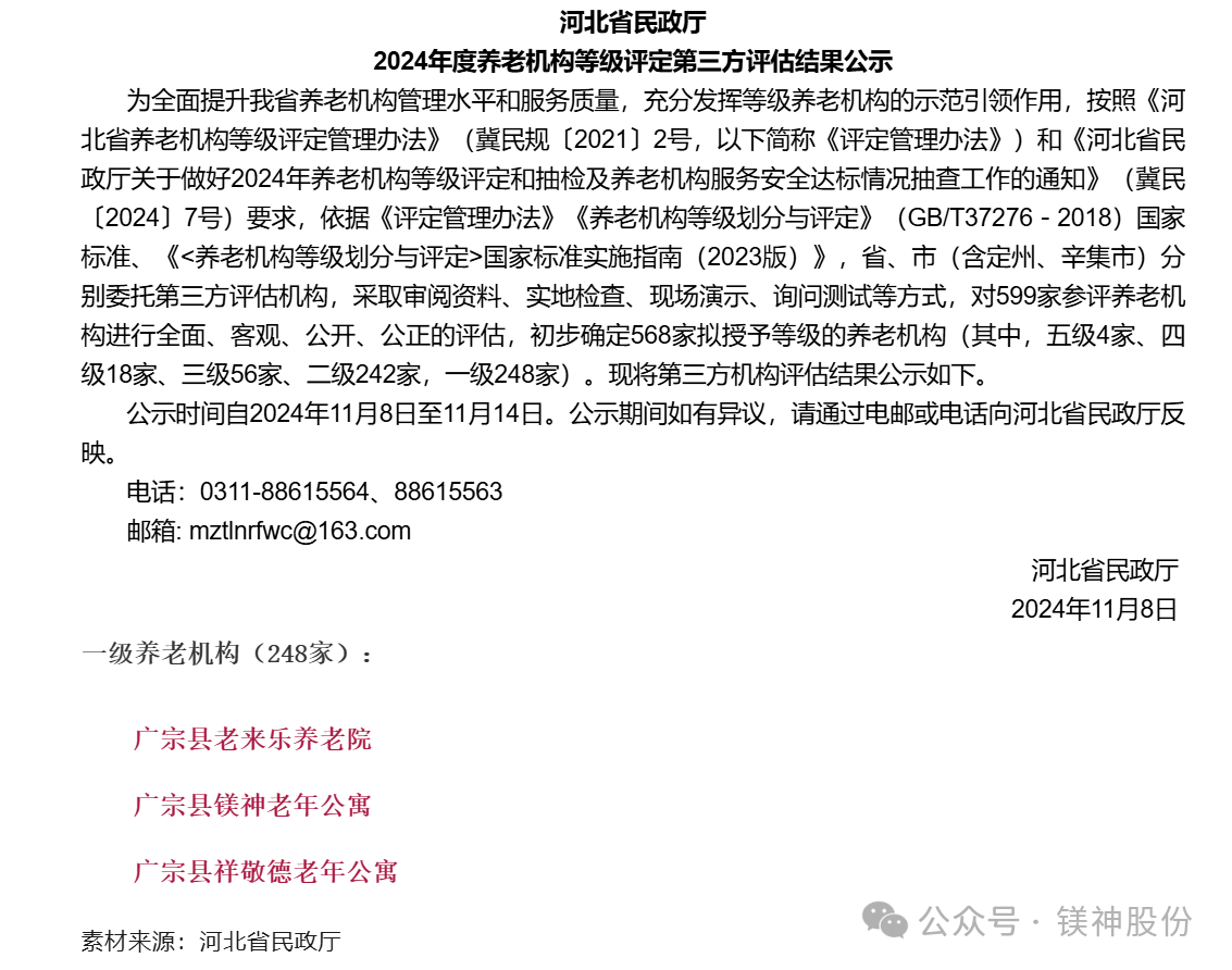 近日,河北鎂神科技股份有限公司旗下的廣宗縣鎂神老年公寓通過養(yǎng)老機(jī)構(gòu)等級(jí)評(píng)定,獲河北省一級(jí)養(yǎng)老機(jī)構(gòu)。